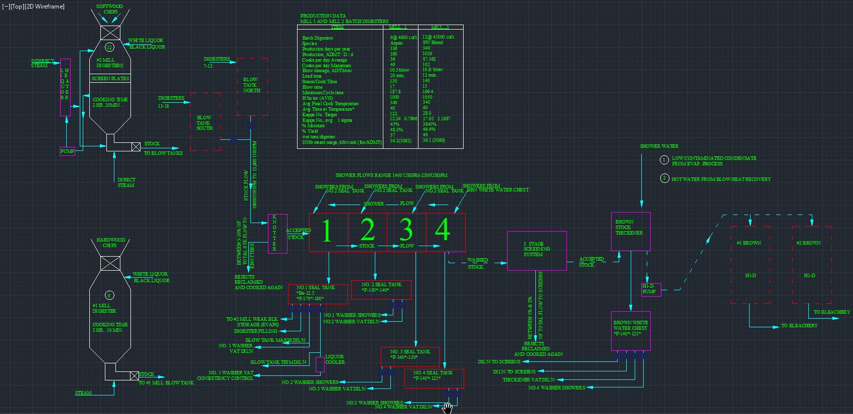 | Pulp Processing Plant | AutoCAD design for a pulp processing plant using two pulp mill digesters. *Does not contain bleaching process for pulp* |